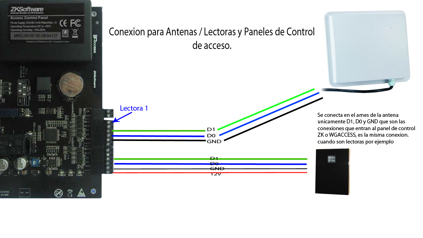 La conexion de la alimentacion 12v la suministra el panel de control al cual va conectado o alimentado a una fuente de poder adicional cuando se conecta a un control de acceso como esclavo
